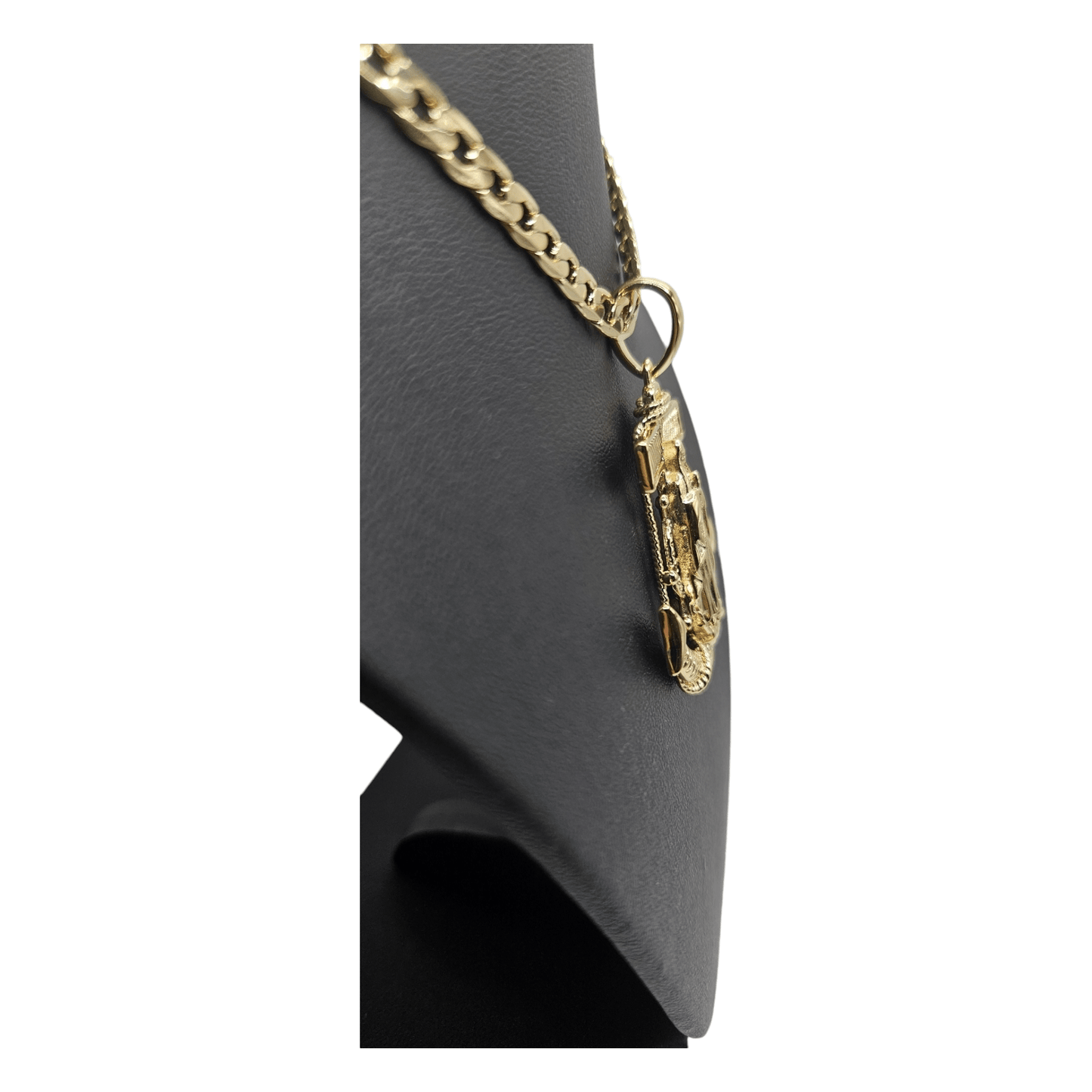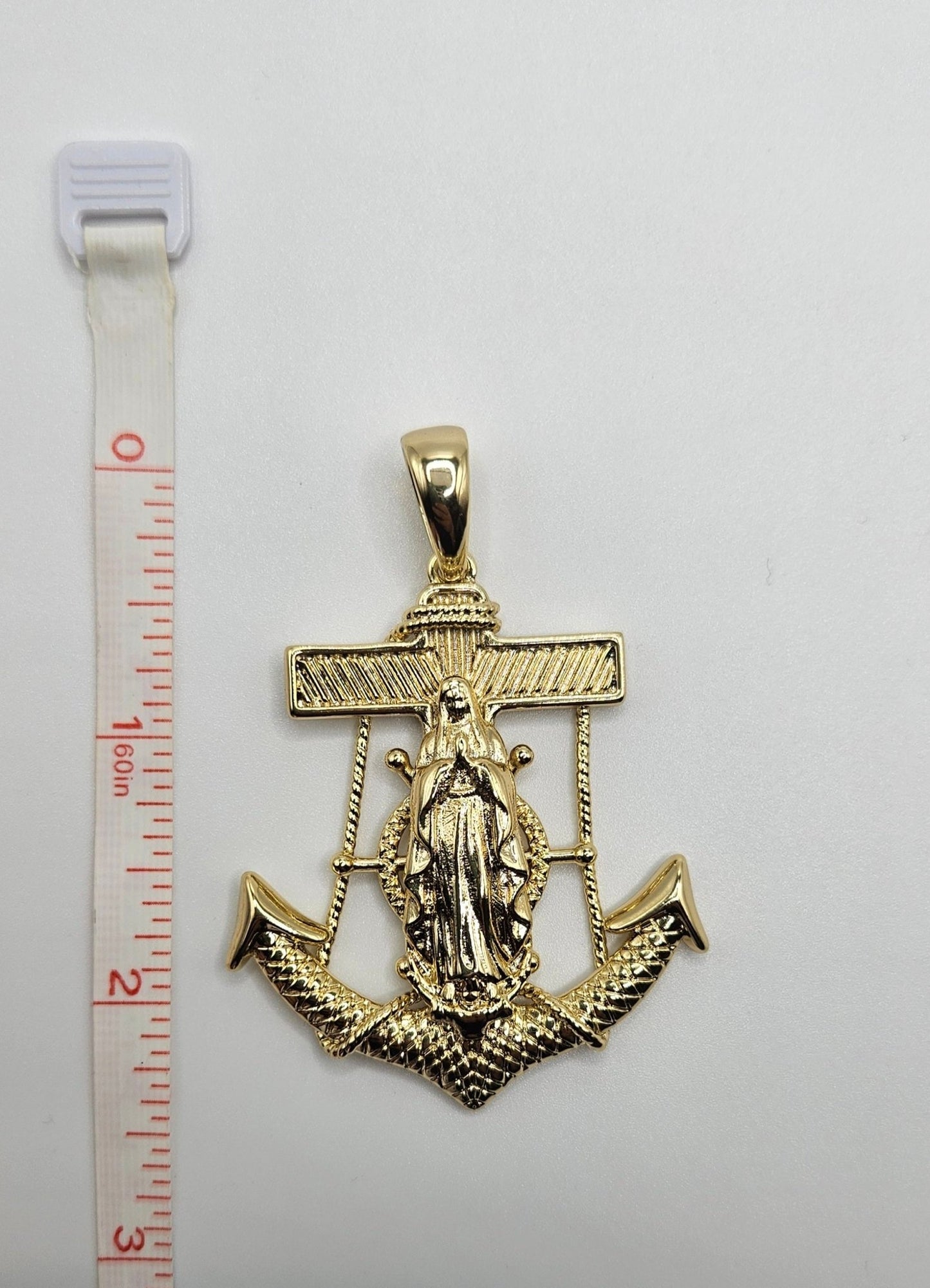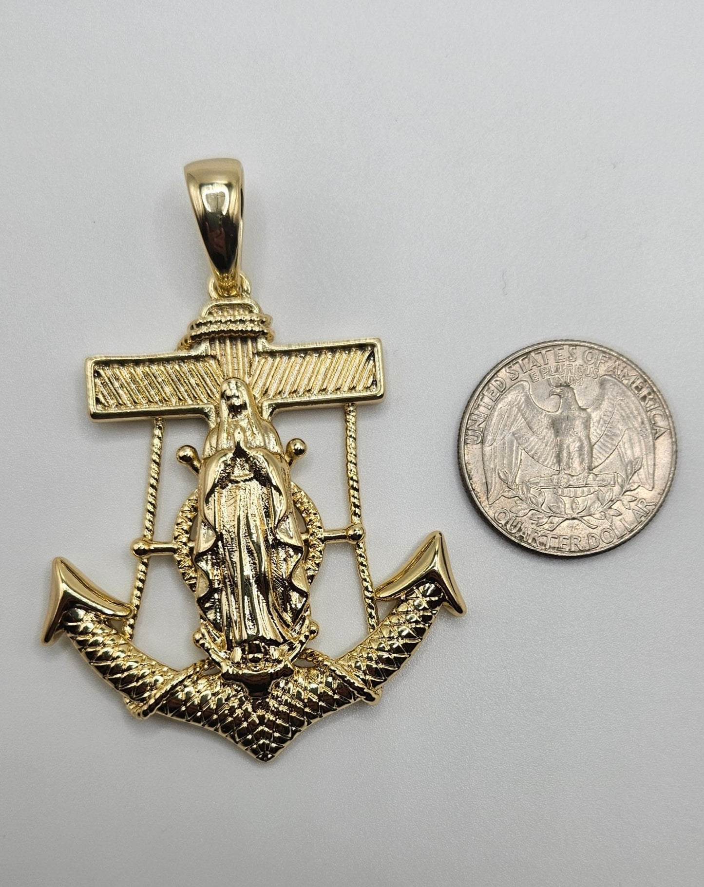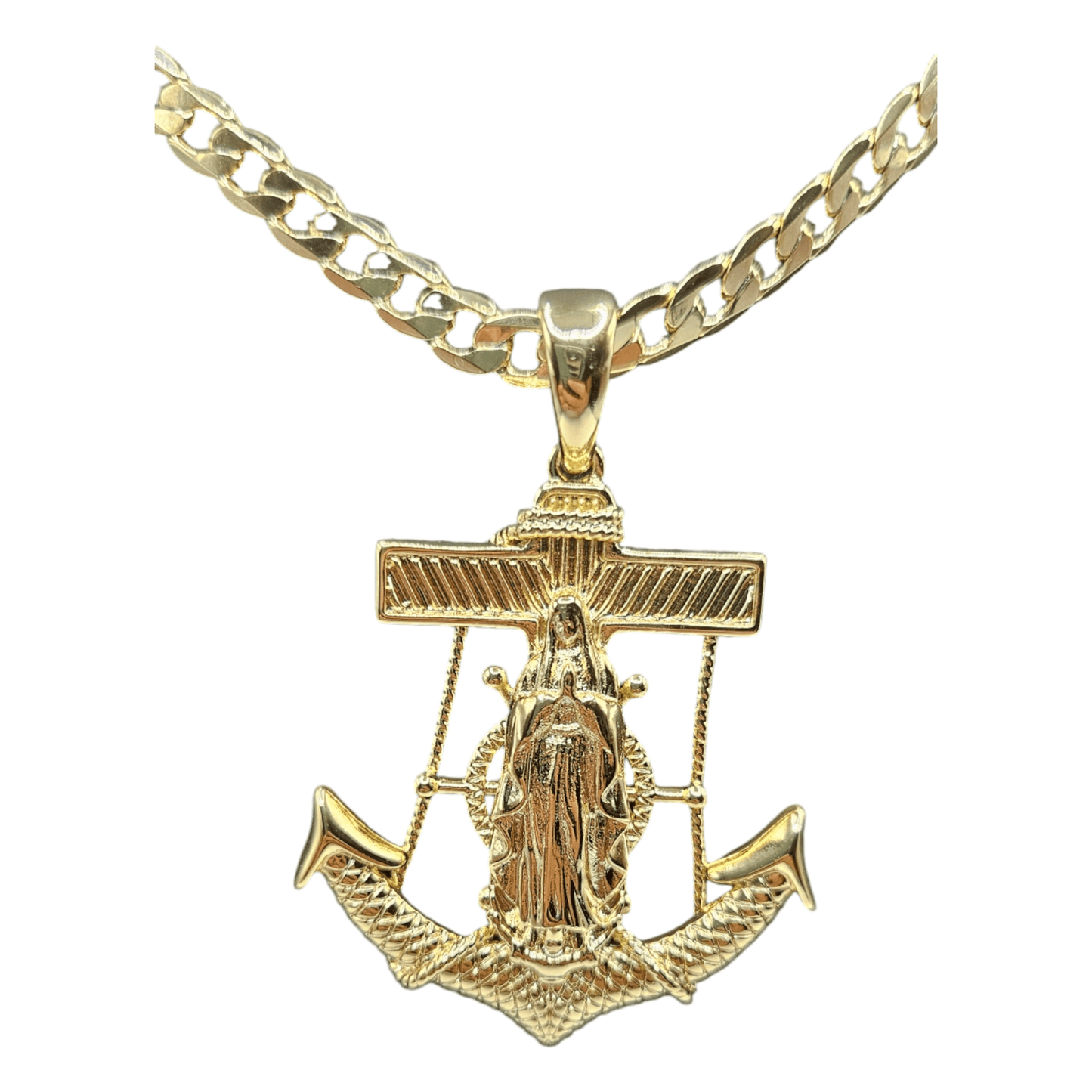 Este collar presenta un ancla bañada en oro de 14k con un llamativo diseño de la Virgen María. El colgante grande sin duda llamará la atención y el baño de oro le agrega un toque de elegancia. Demuestre su fe y estilo con esta pieza única.