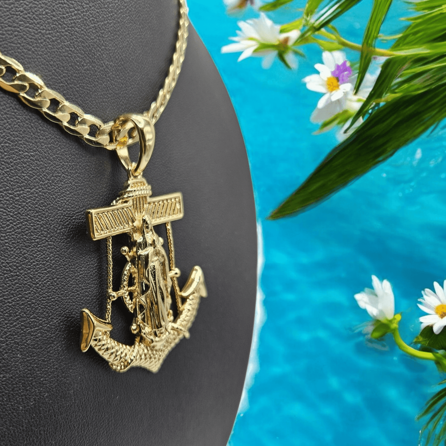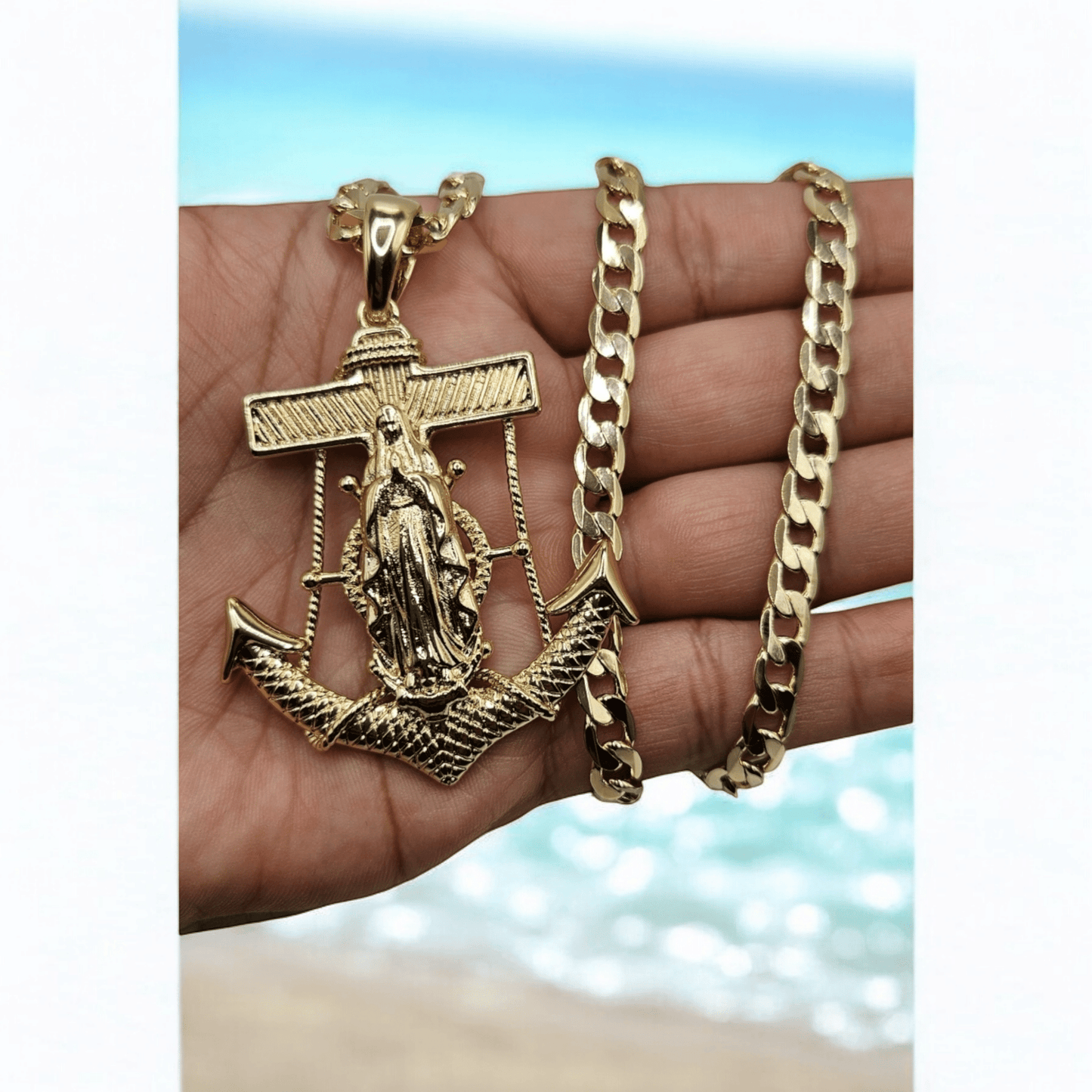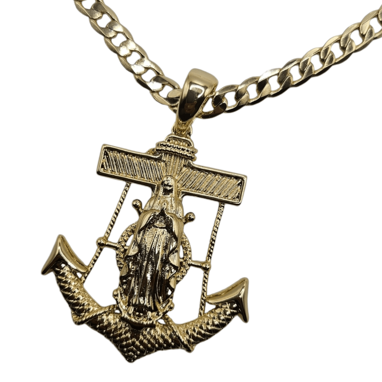 Collar con ancla y Virgen María bañado en oro de 14k - Grande
