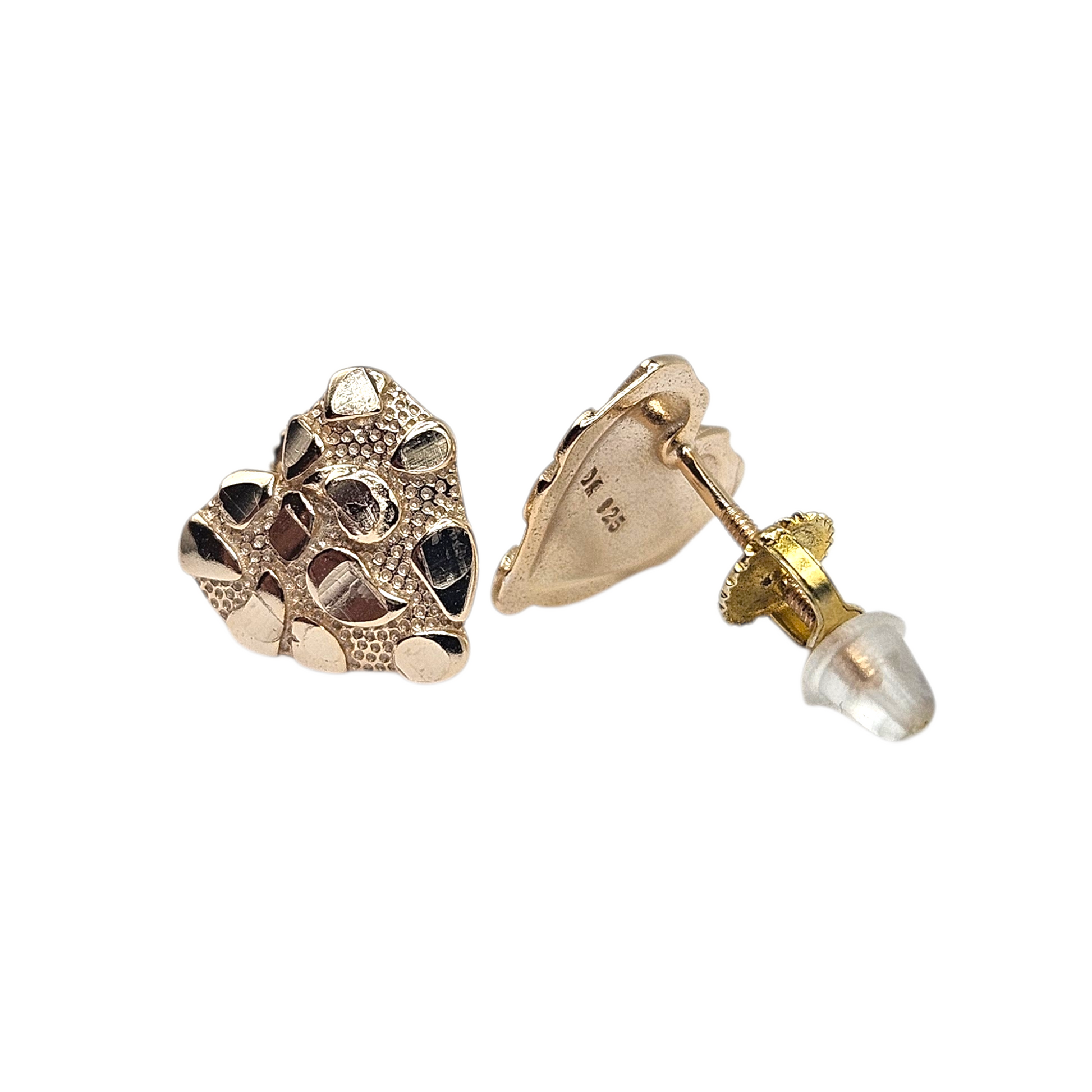 These 14K gold plated over silver 925 stud earrings feature a charming Heart Nugget design, making them a perfect addition to any woman's accessories collection. The elegant and timeless design adds a touch of sophistication to any outfit. Crafted with quality materials, these earrings are durable and long-lasting.