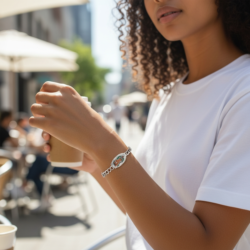 Esta pulsera de plata 925 presenta un diseño tridimensional de la Virgen María, símbolo de pureza y gracia. Cadena estilo Fígaro. Fabricada con materiales de alta calidad, es una pieza atemporal y elegante que añade un toque de espiritualidad a cualquier look. Demuestra tu devoción y estilo con la pulsera de la Virgen María.