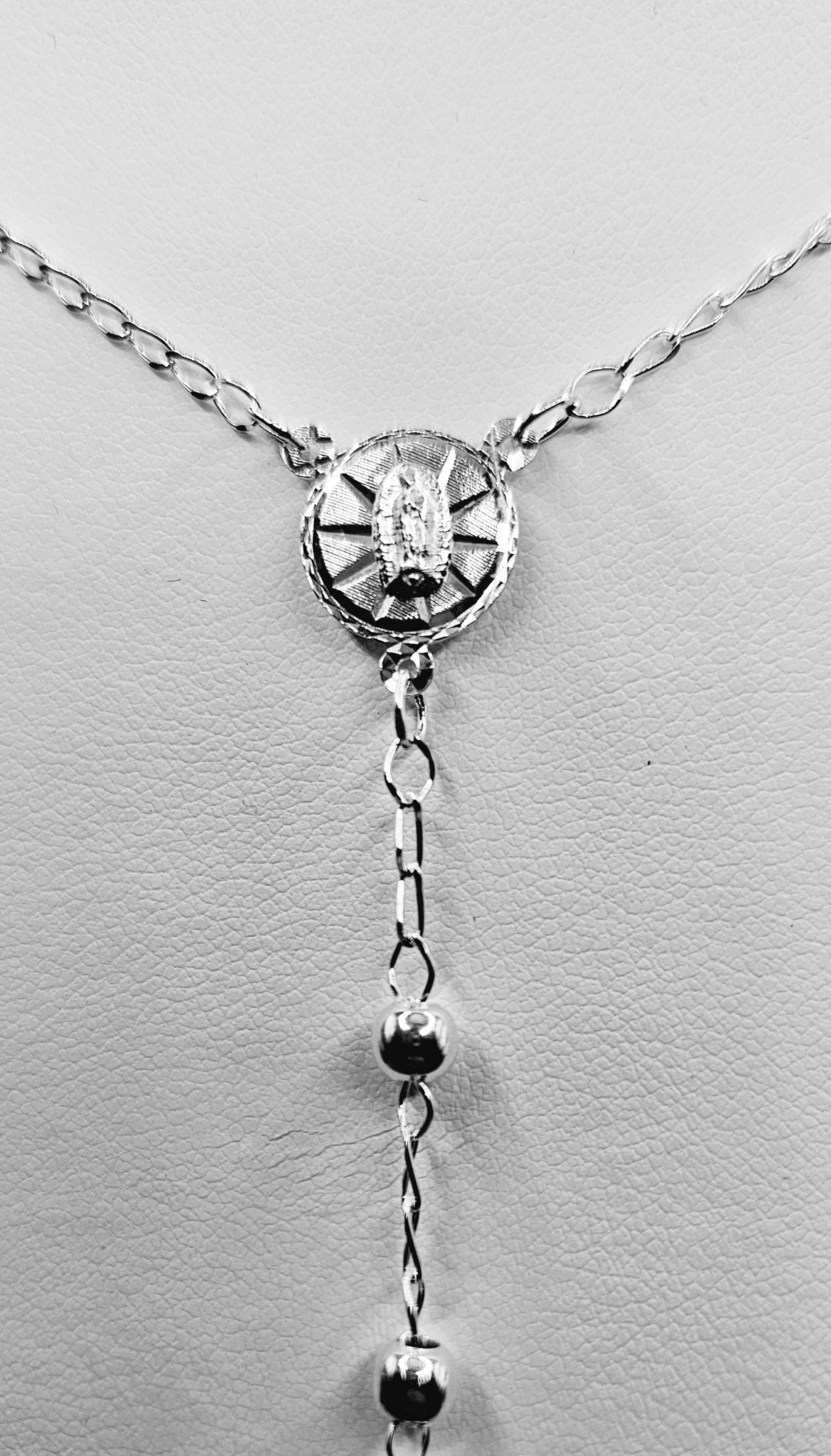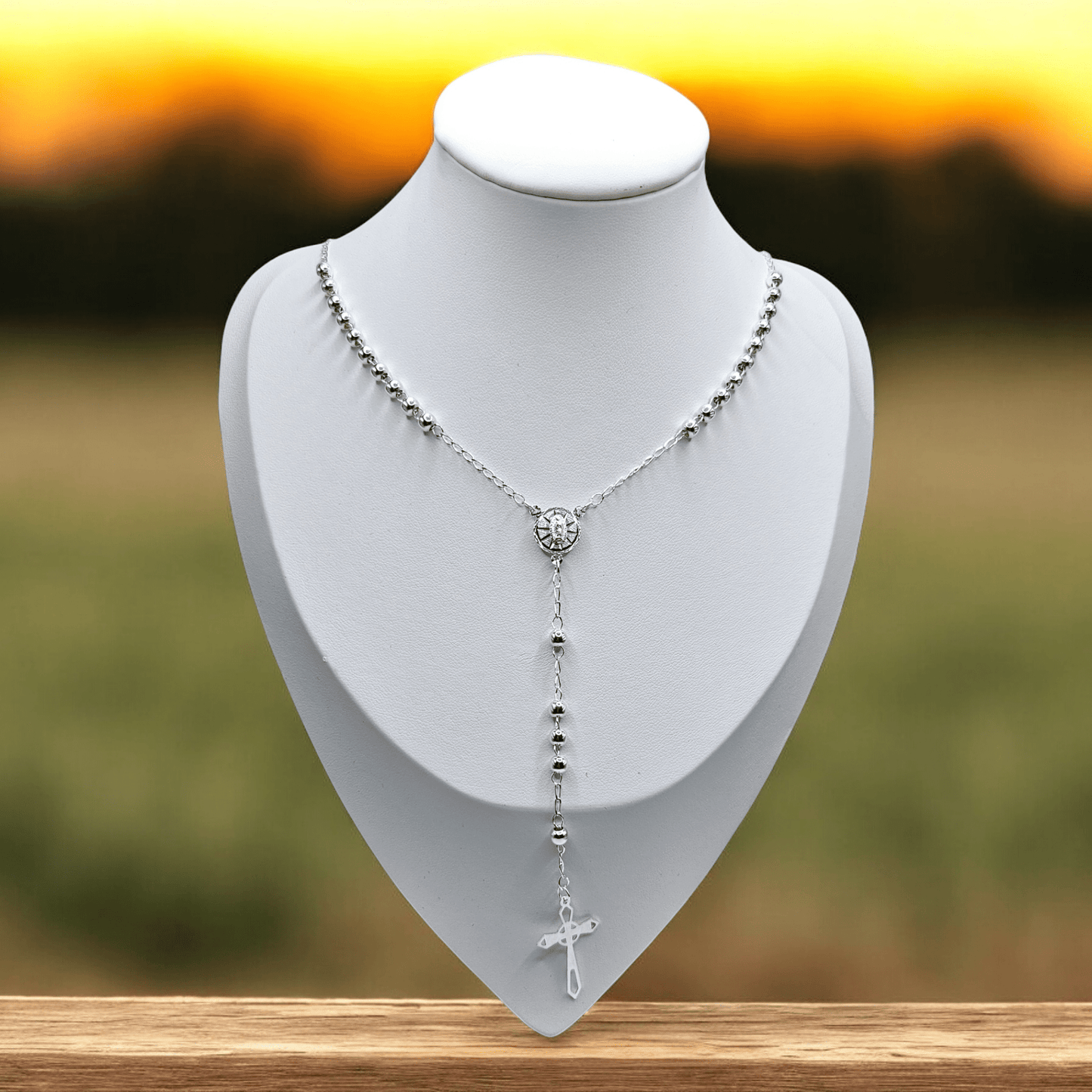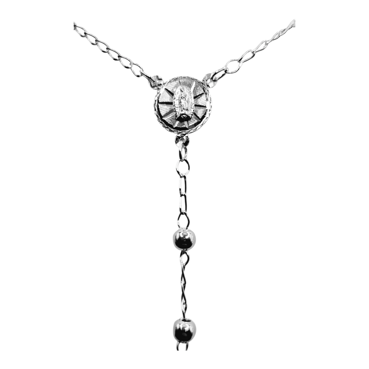 Este collar de cuentas de rosario, elaborado por expertos en plata 925, presenta un hermoso colgante de la Virgen María y una cruz. El accesorio perfecto para cualquier ocasión, ofrece estilo y significado espiritual. Hecho para durar, su material de plata brinda un aspecto atemporal y elegante.
