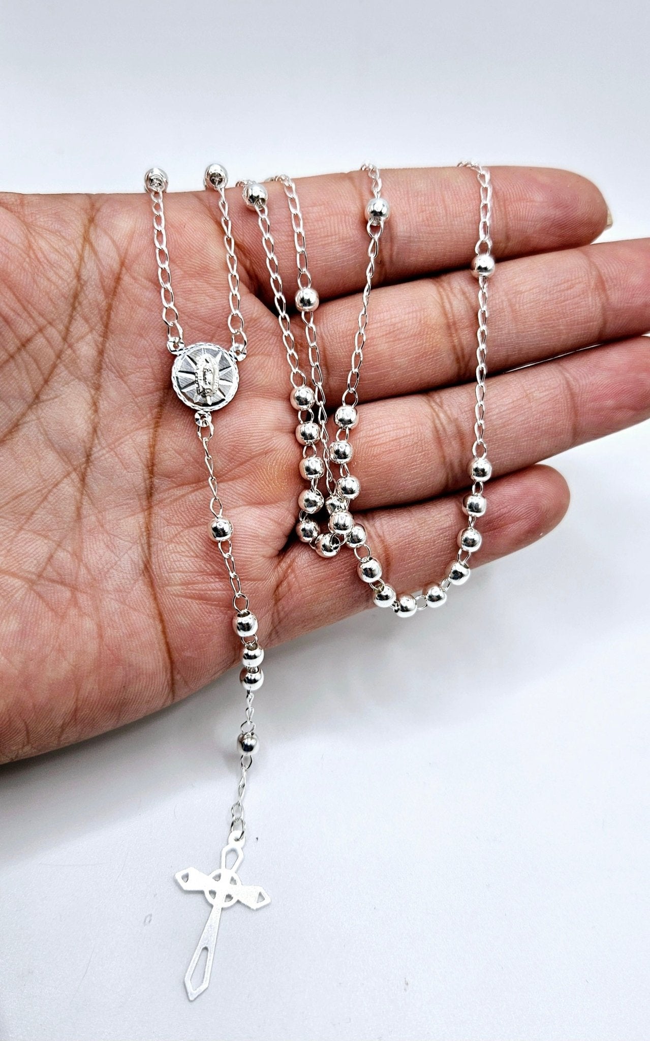 Collar de rosario de plata de ley S925 de 24 pulgadas, símbolo religioso cristiano, regalo perfecto para Pascua.