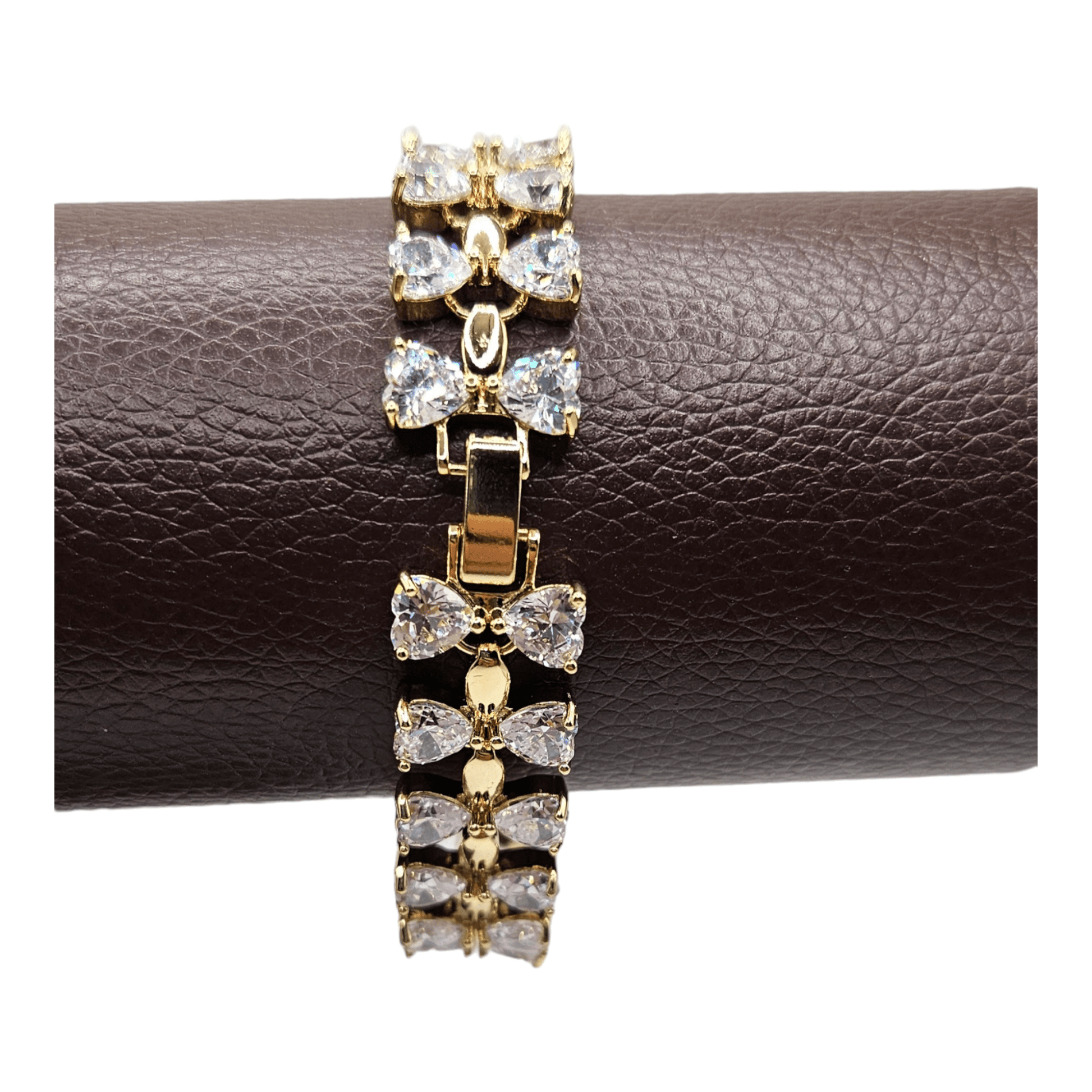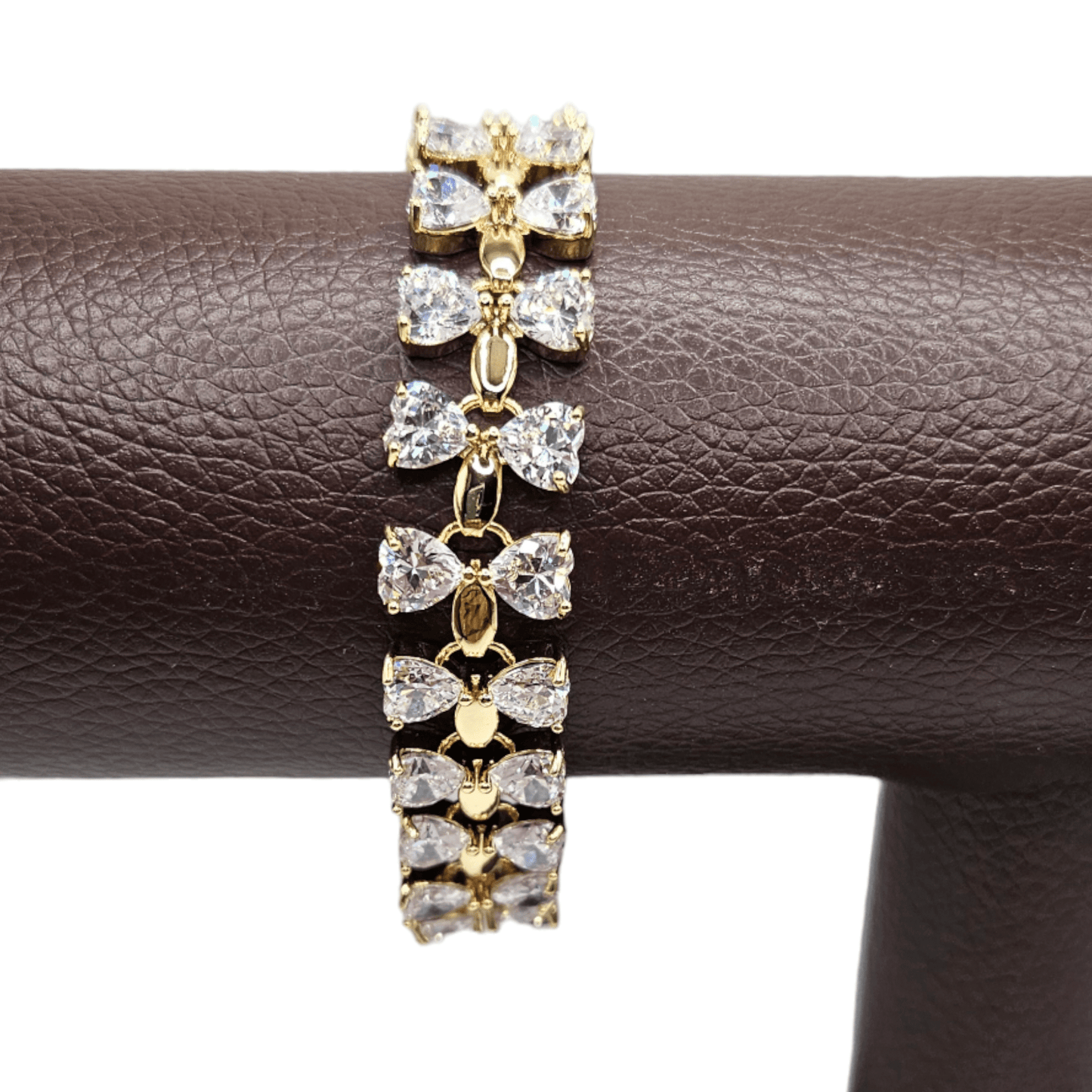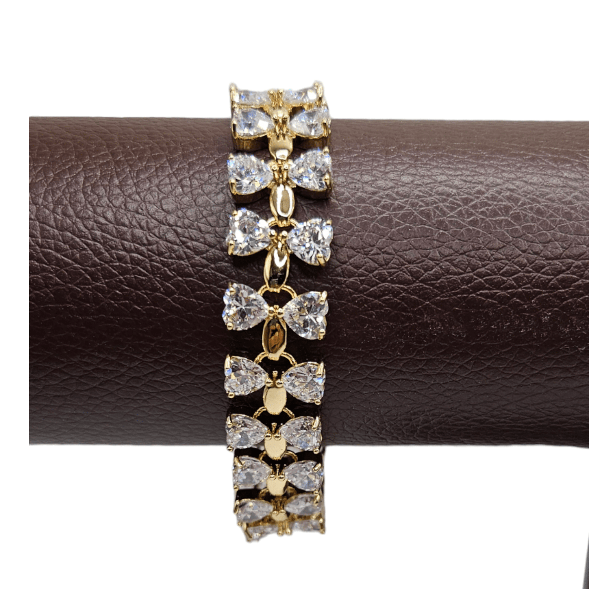 This elegant bracelet features large cubic zirconia white stones in a bowtie design, set in 14k gold plating. The high-quality stones add a touch of sparkle to any outfit, making it the perfect accessory for any formal occasion. Elevate your style with this stunning and versatile bracelet.