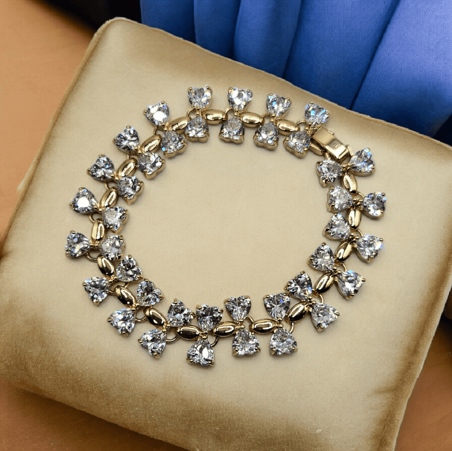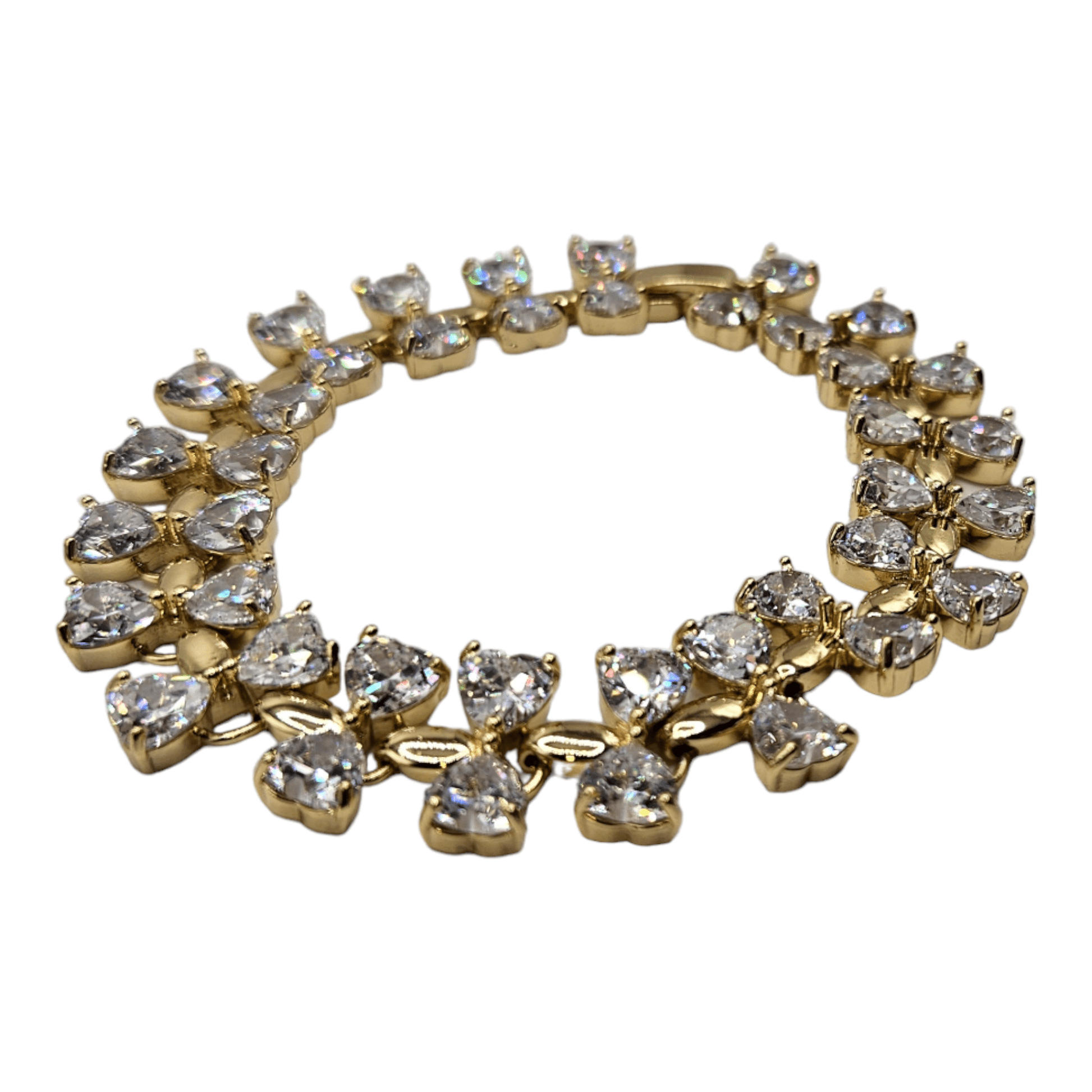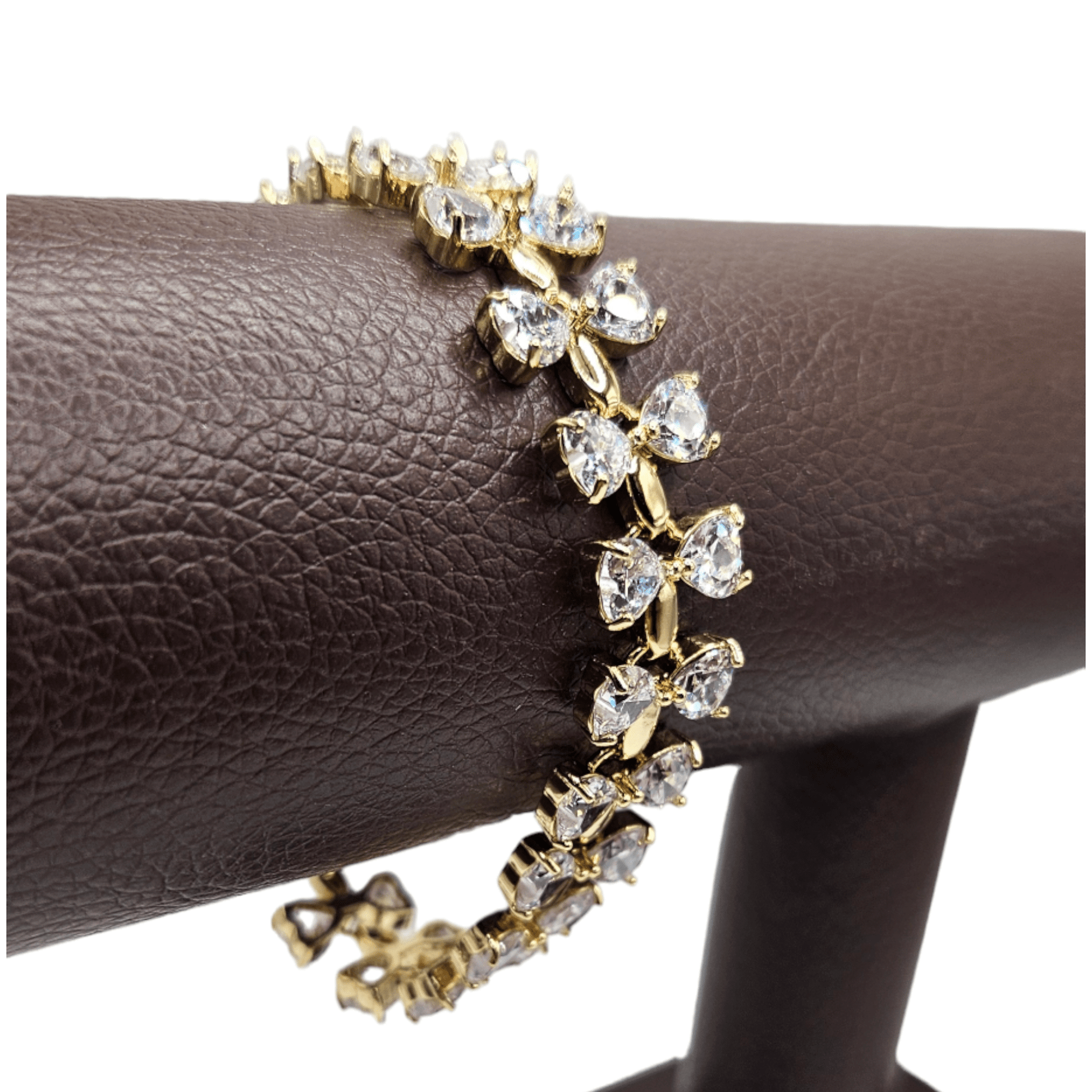 This elegant bracelet features large cubic zirconia white stones in a bowtie design, set in 14k gold plating. The high-quality stones add a touch of sparkle to any outfit, making it the perfect accessory for any formal occasion. Elevate your style with this stunning and versatile bracelet.