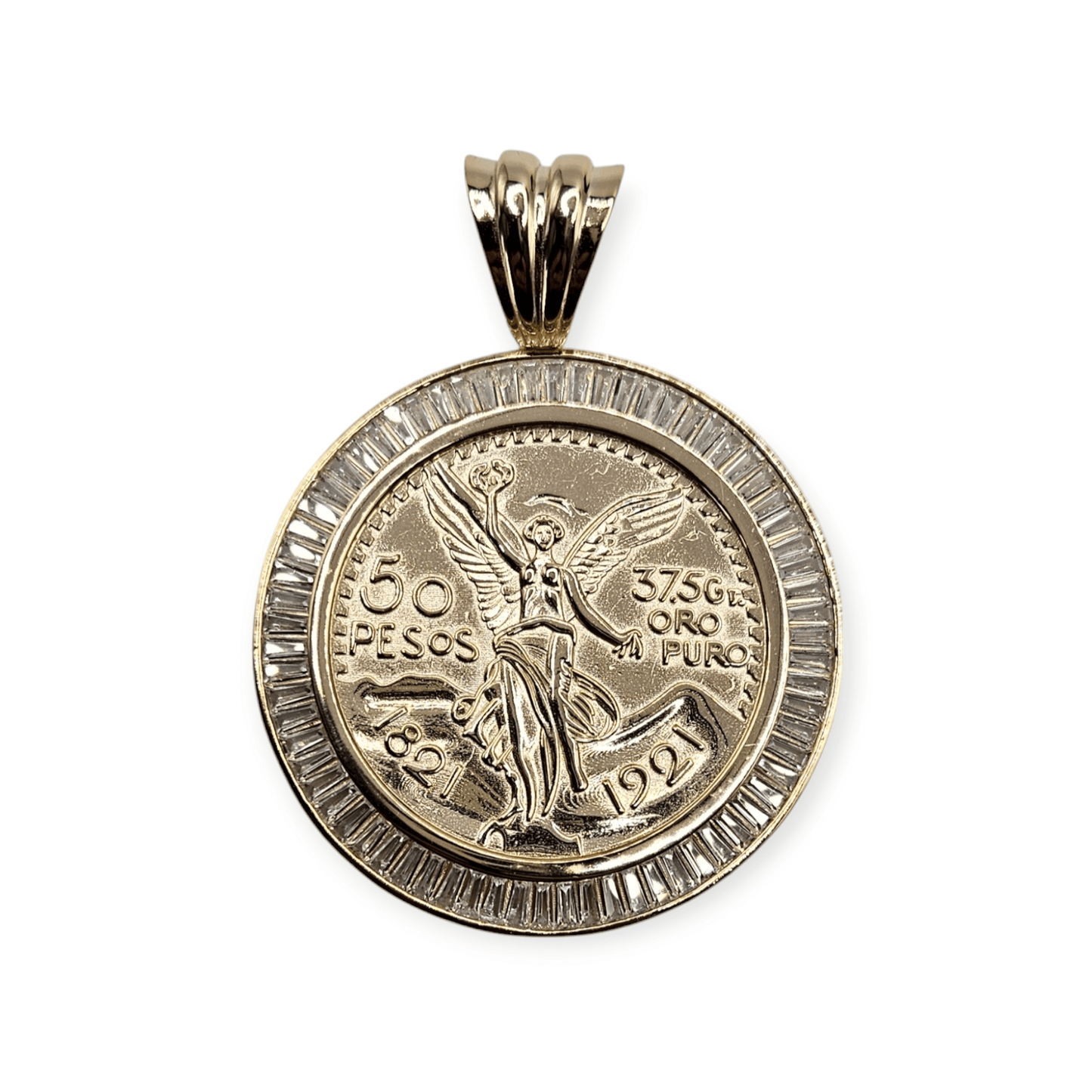 This stylish pendant features a Centenario 50 Pesos coin with 14K gold over silver 925, accented with stunning white cubic zirconia stones. Elevate your style with this unique and elegant piece, perfect for any occasion. Add a touch of luxury to your look with this Mexican 50 pesos pendant.