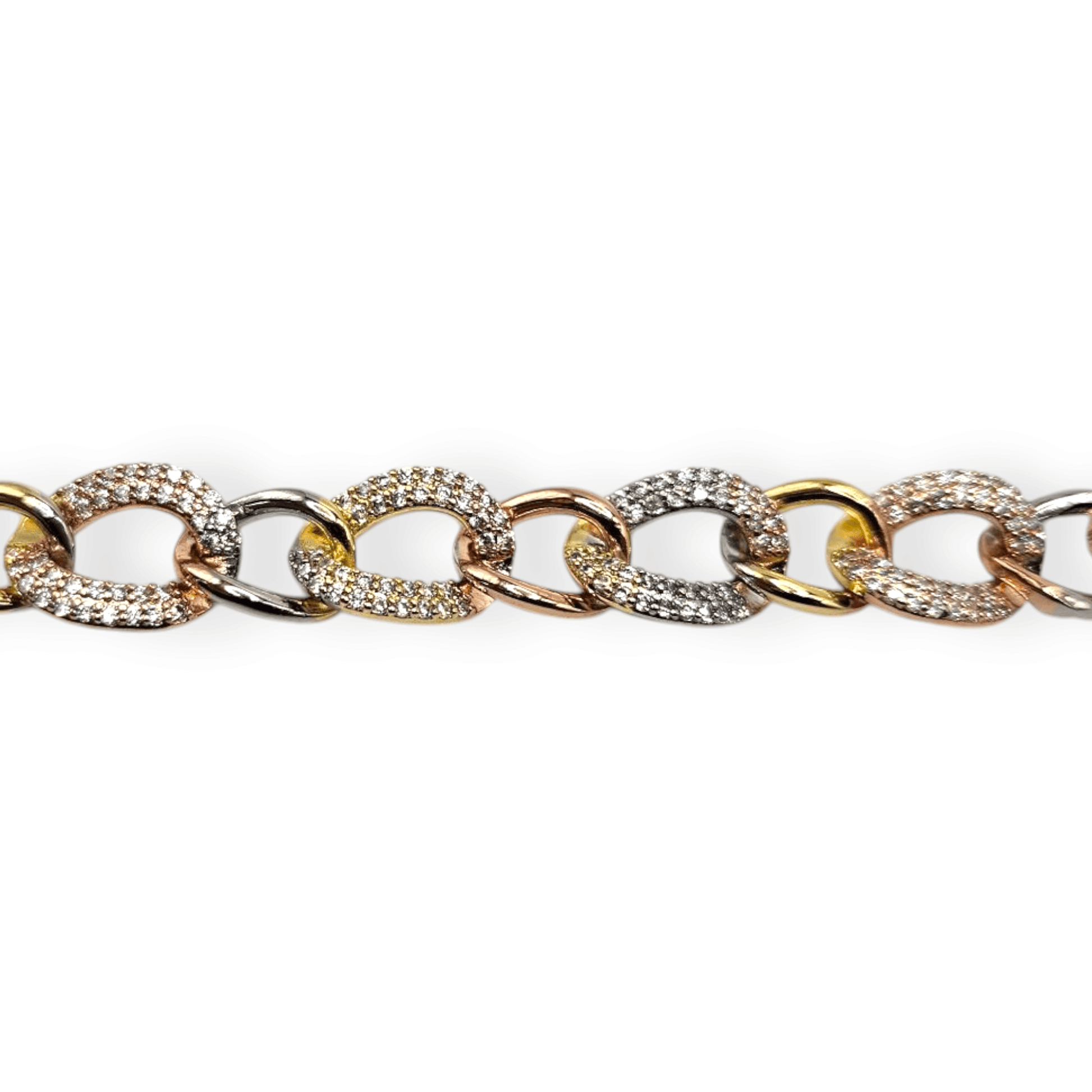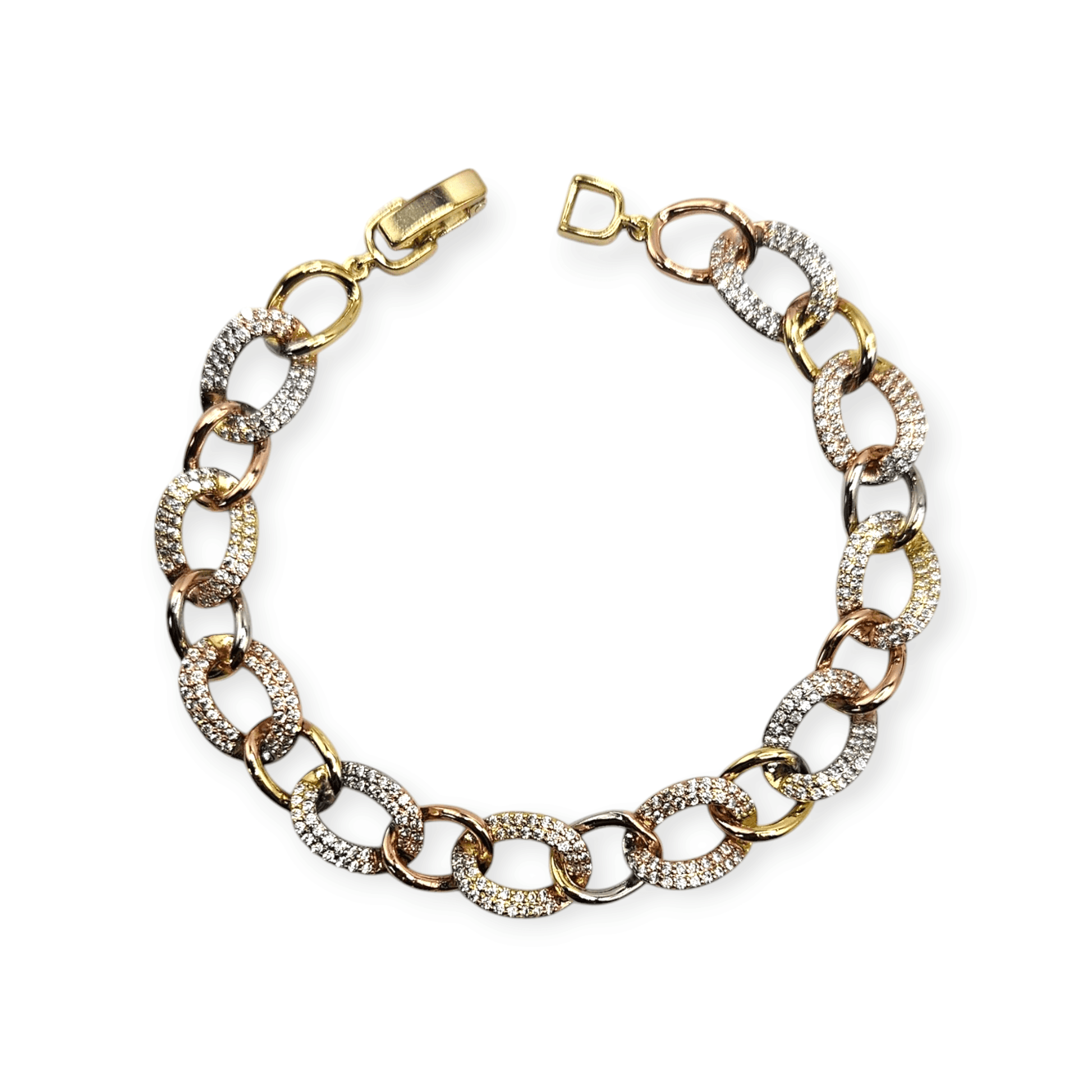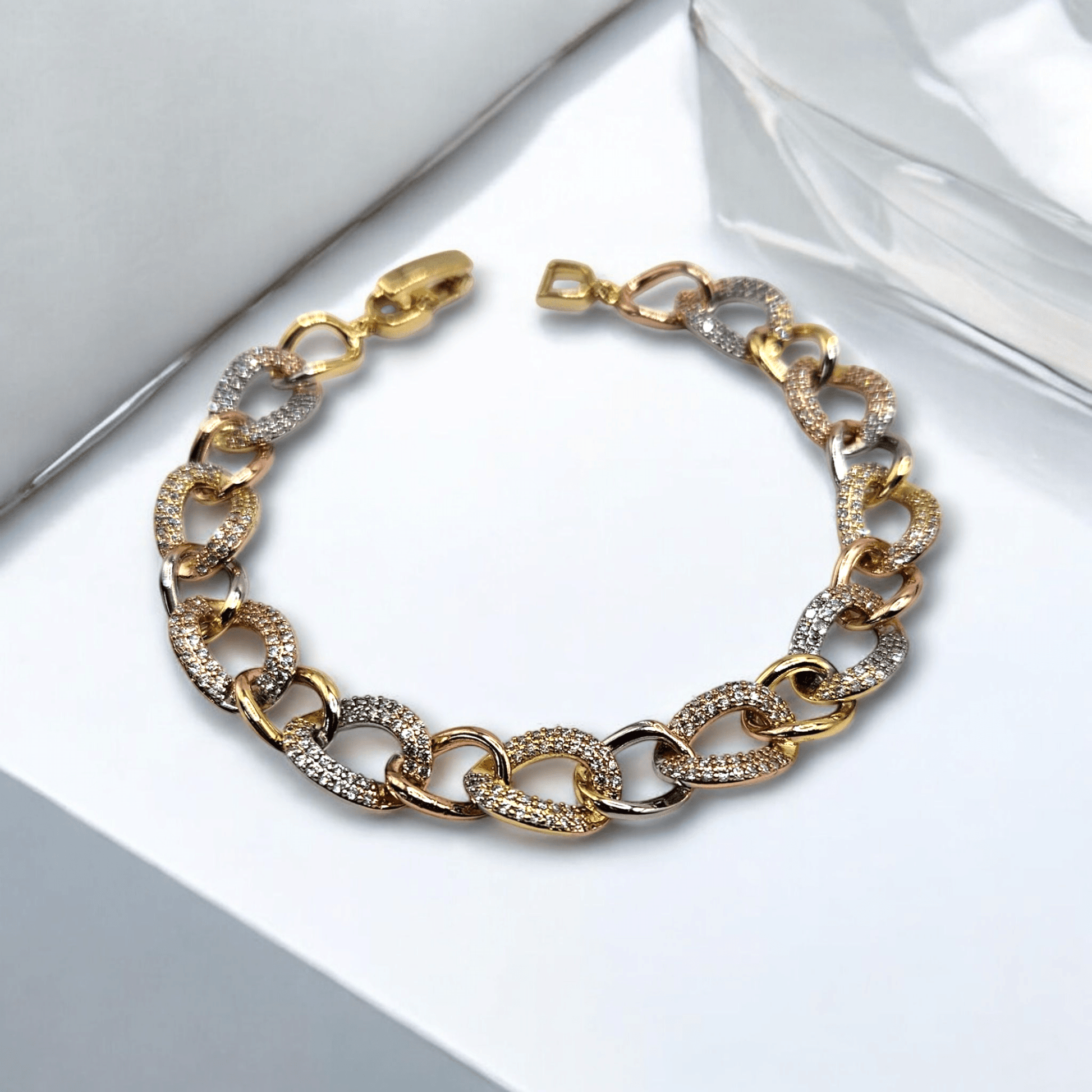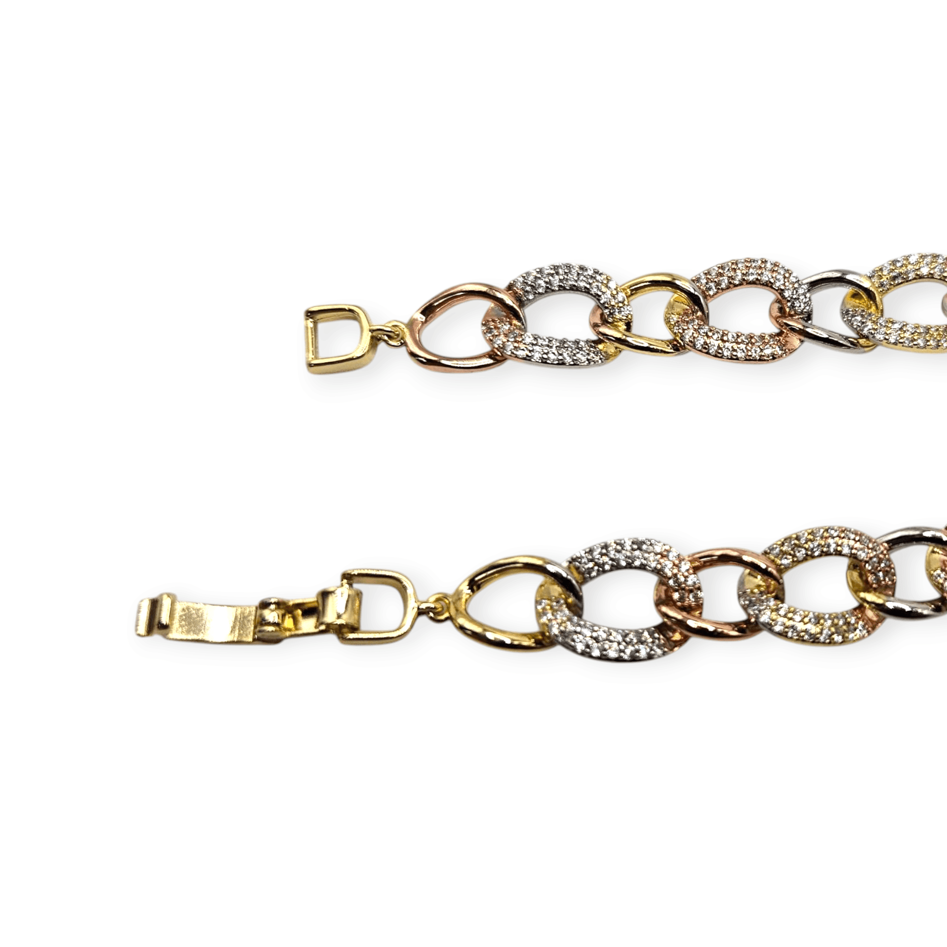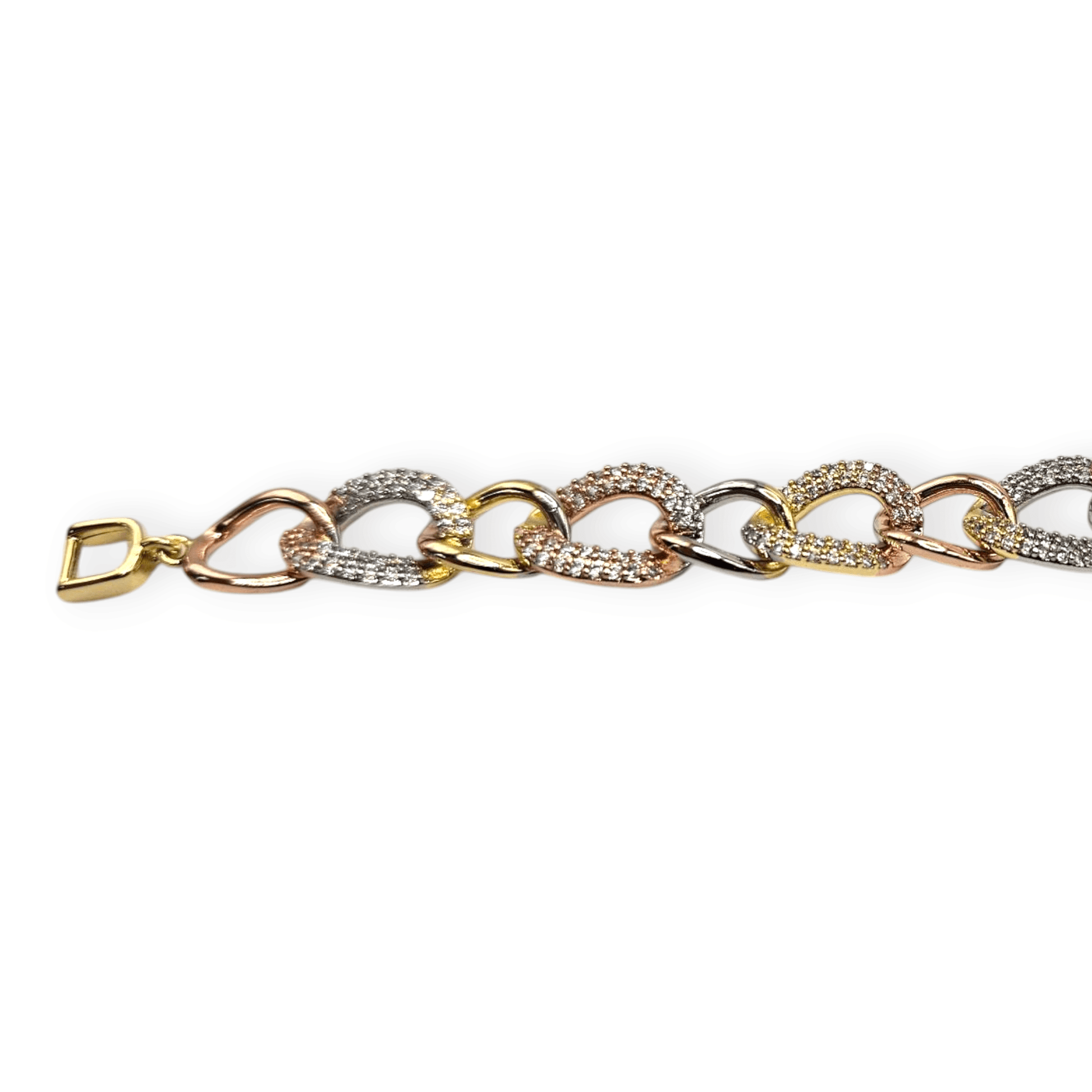 Effortlessly elevate your style with our Fancy Link Fashion Tricolor Gold Plated Bracelet. The unique tricolor oval link design, 14k Gold Plated with pink gold and silver, is adorned with sparkling white Cubic Zirconia for a touch of glamour. Measuring 7"L with a .5" extension, this bracelet will add a luxurious touch to any outfit.