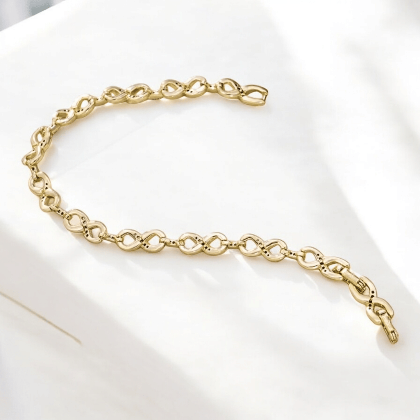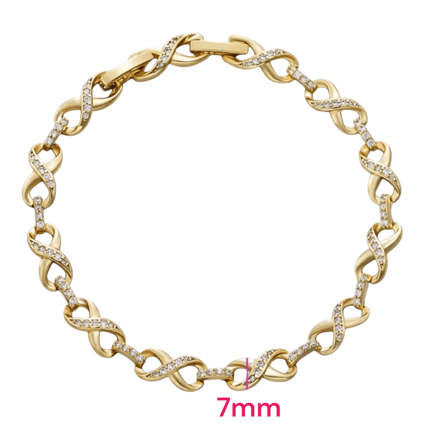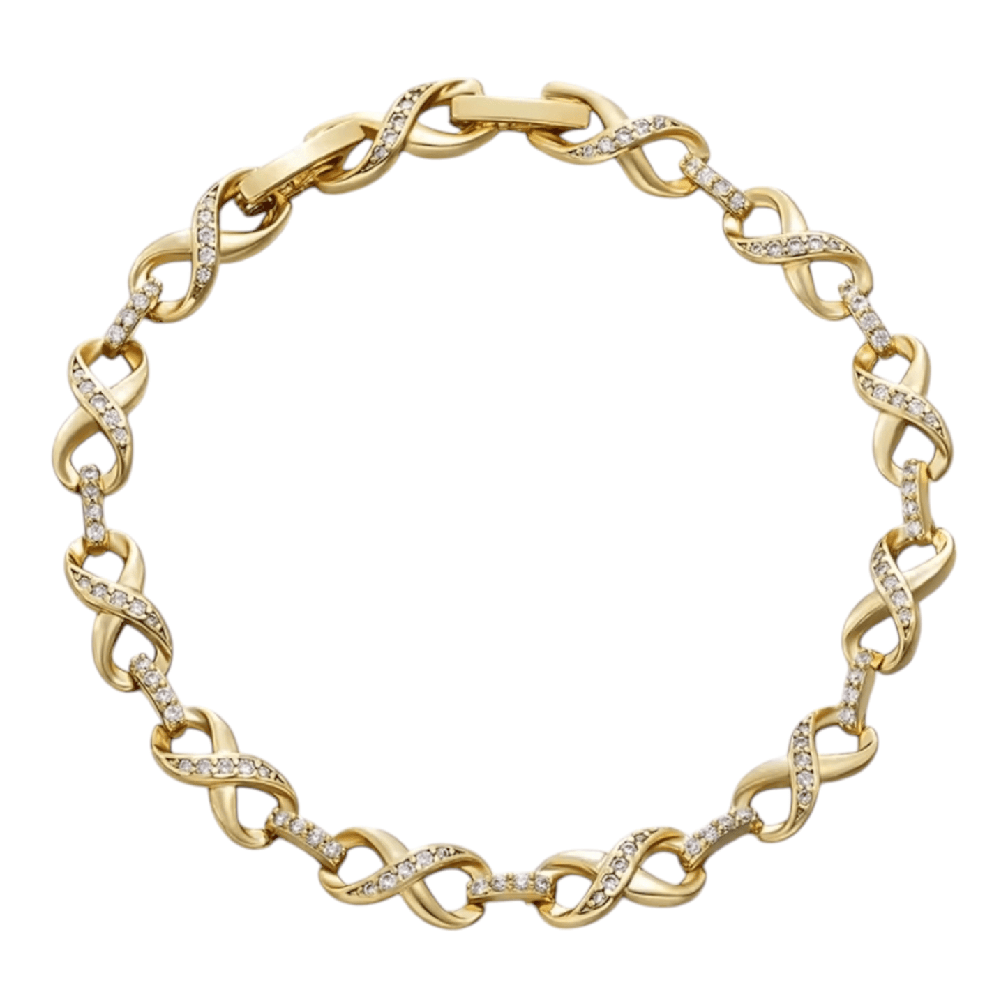 This stunning 14K gold-plated bracelet, crafted over high-quality copper, adds a touch of elegance to any outfit. The infinity design with Cubic Zirconia stones accents make a bold statement without being too heavy or overwhelming. Upgrade your accessory game with this luxurious piece.