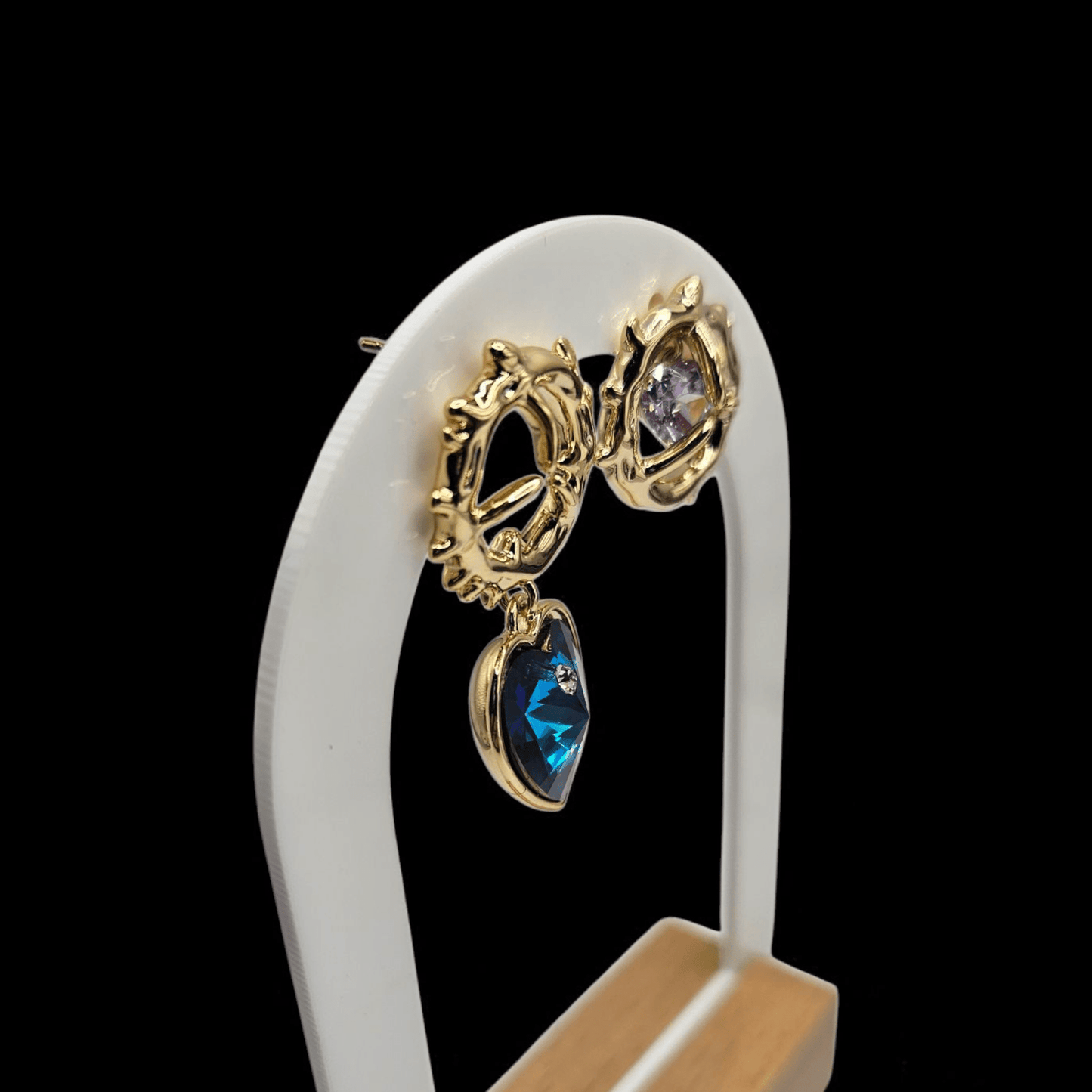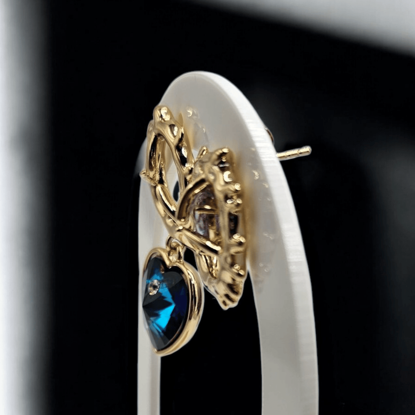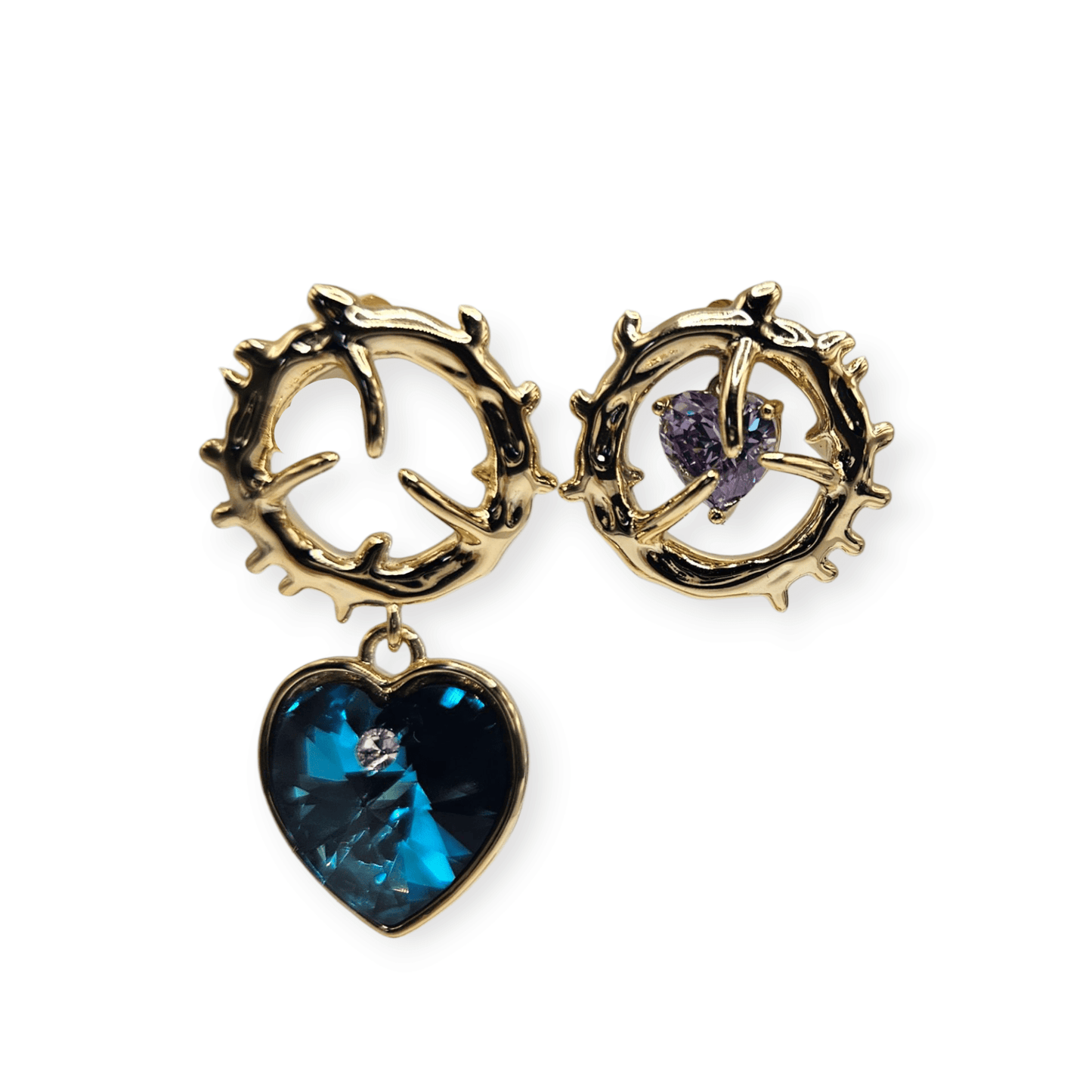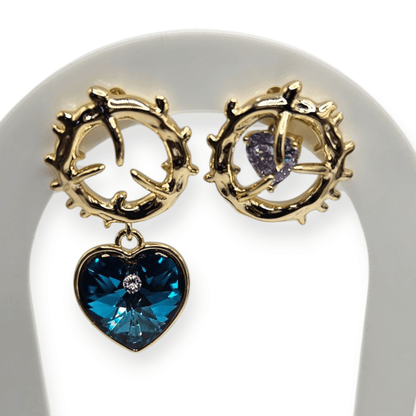 Add a touch of whimsy to your jewelry collection with our Large Heart Fashion 14k Gold Plated Cubic Stud Earrings. This earring set features a crystal large blue heart and small pink heart, both adorned with a sparkling white cubic zirconia stone. With 14K gold plating, these earrings are sure to elevate any outfit.