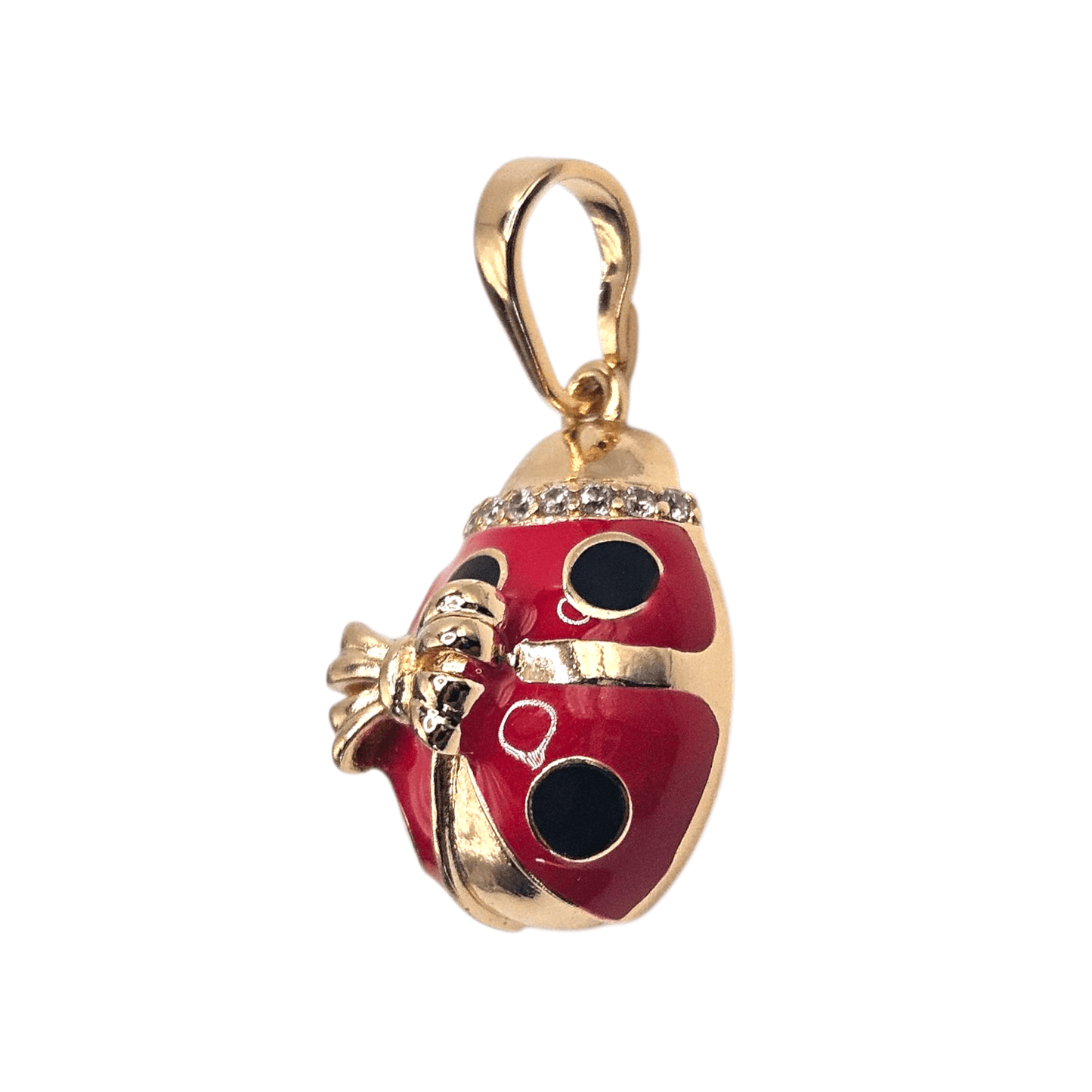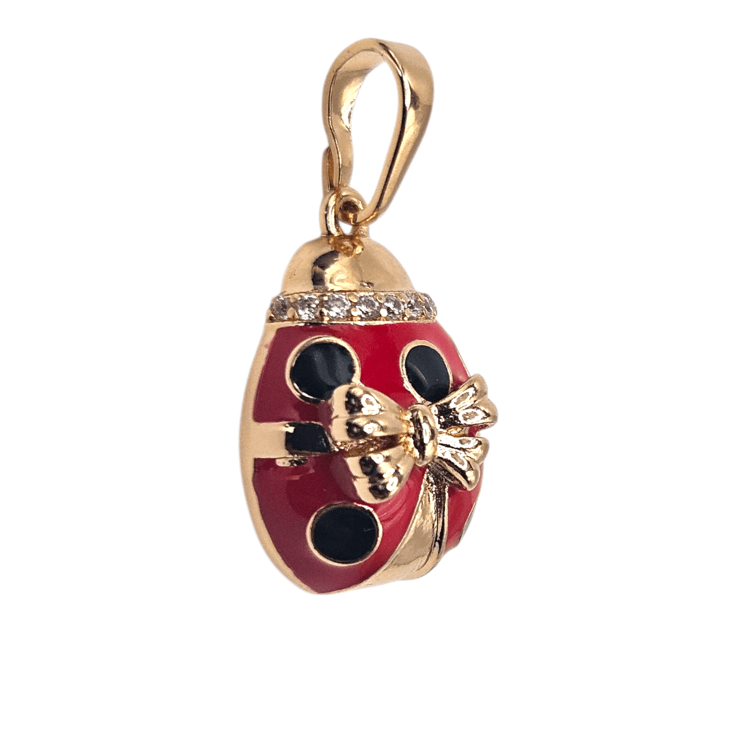 This 18K rose gold plated Red Lady Bug pendant is adorned with sparkling white cubic zirconia stones and a beautiful bow, adding a touch of whimsy and elegance to any outfit. The delicate design and high-quality materials make it a must-have for any jewelry collection. Perfect for adding a touch of magic to your day.