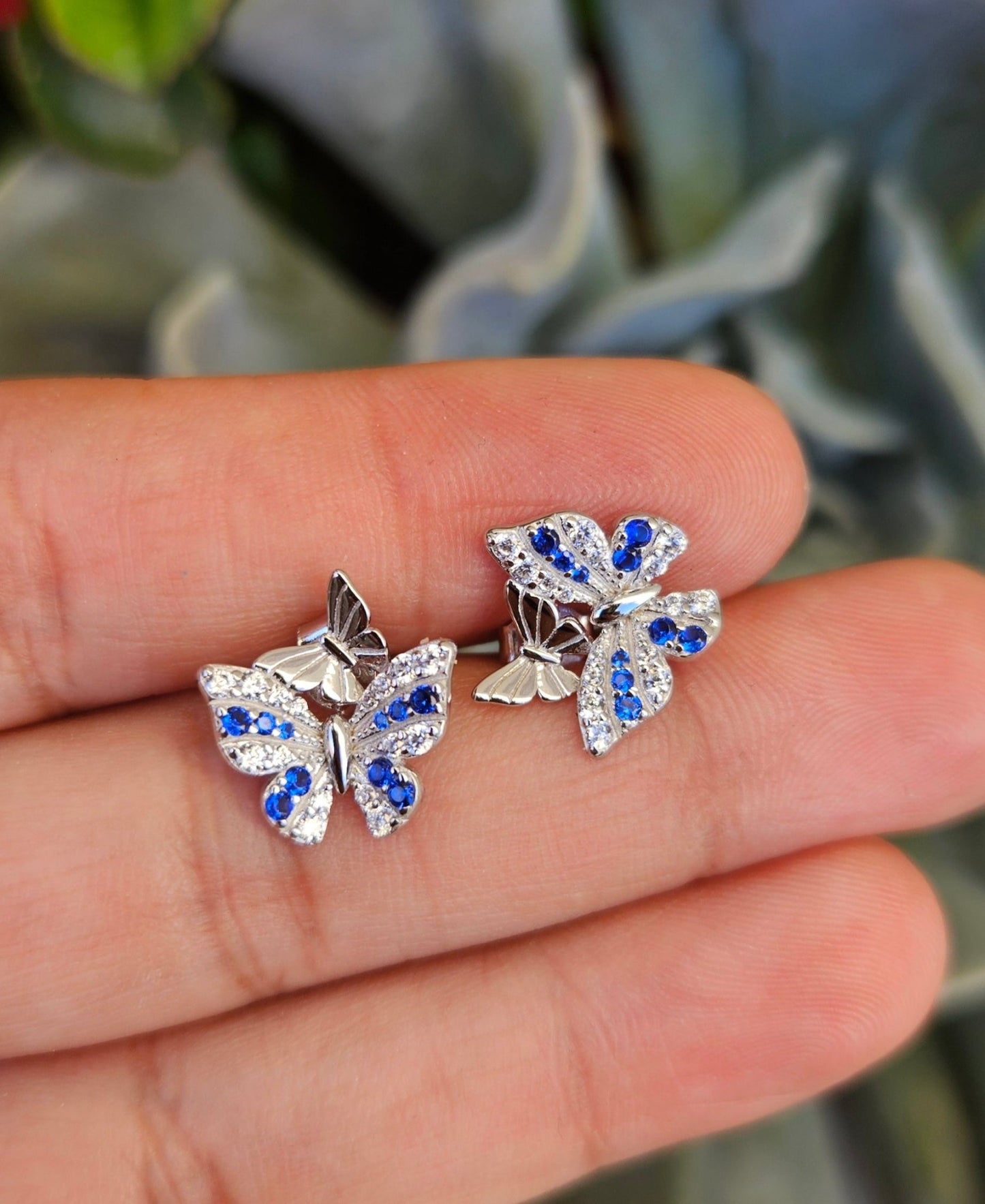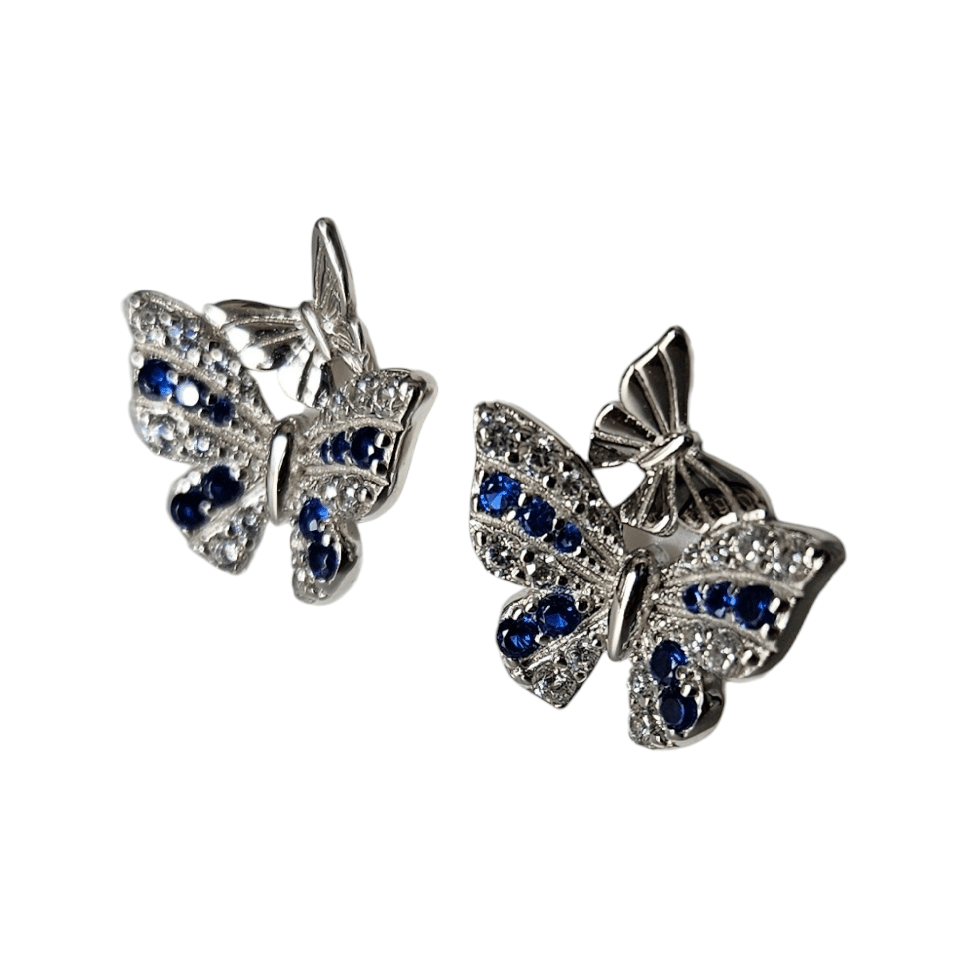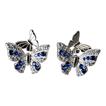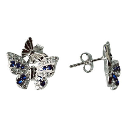 These sapphire and white CZ stud earrings are the perfect balance of elegance and playfulness. The butterfly design adds a touch of whimsy, while the sapphire and white CZ stones provide a luxurious sparkle. Made with 925 silver, these earrings are both stunning and durable. Perfect for any occasion!
