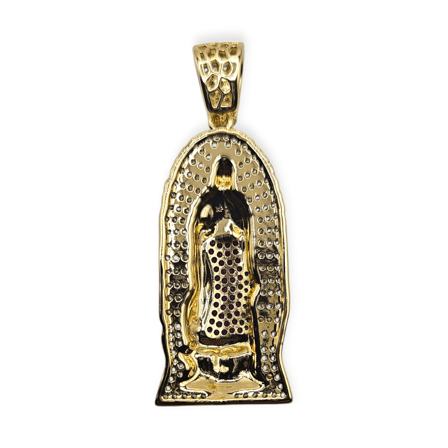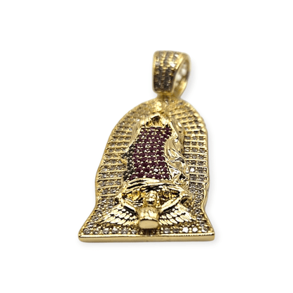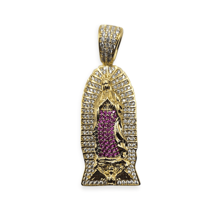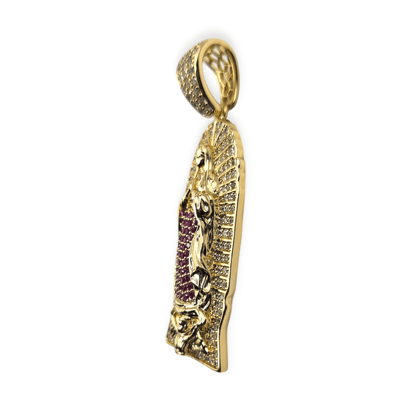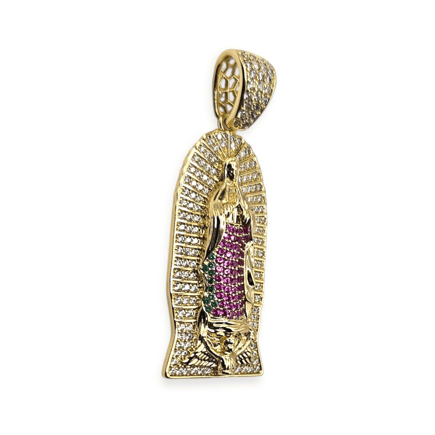 Expertly crafted, the Virgen Maria 14K Gold Plated Pendant shines with a 3D design of Virgen de Guadalupe. The sparkling white, green, and red cubic zirconia stones add a touch of elegance to this unisex piece. Embrace your faith with this stunning pendant.