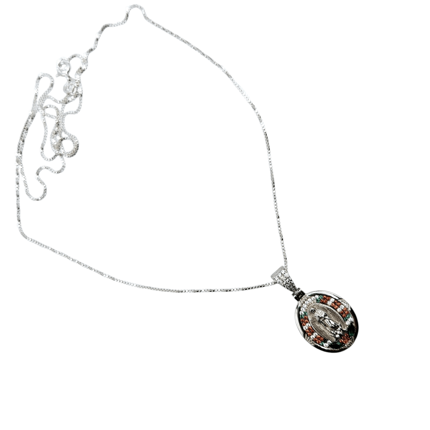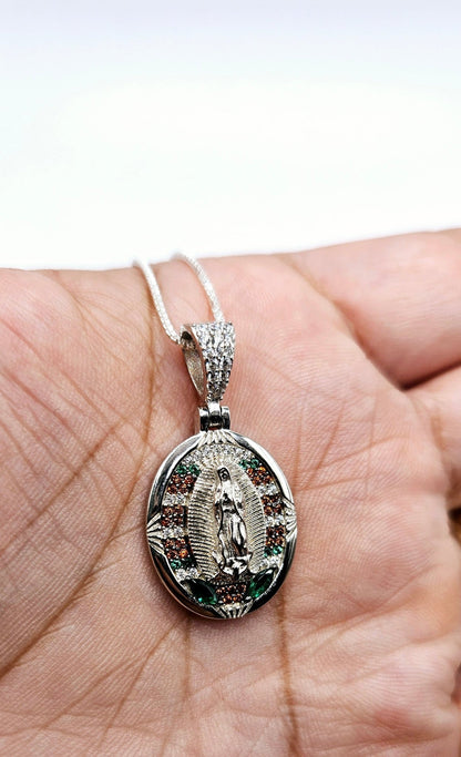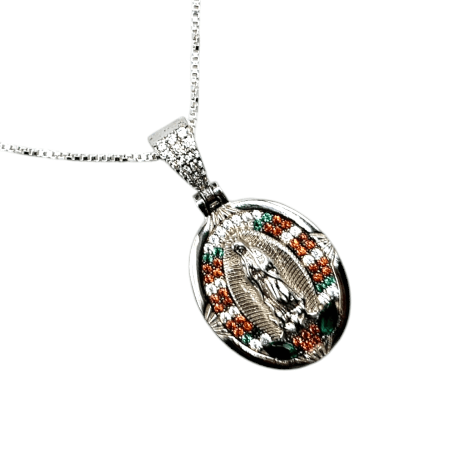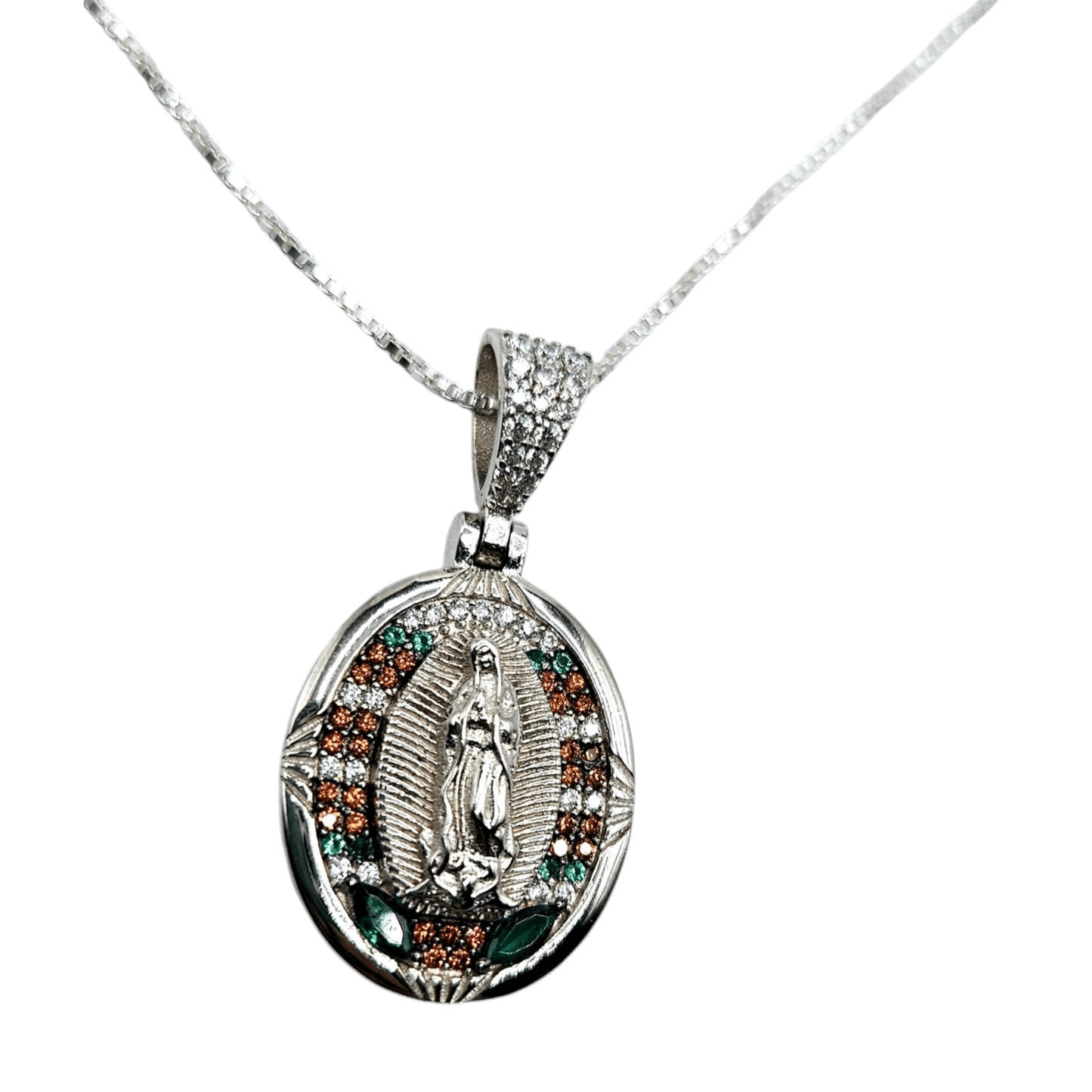 This Necklace is composed of a beautiful Virgen Mary pendant, crafted from Silver 925, features a detailed design and sparkling cubic zirconia stones in green, red and white colors. Choose to purchase the pendant only or as a necklace with the included 22" box chain Silver 925. A beautiful and meaningful accessory for any occasion.