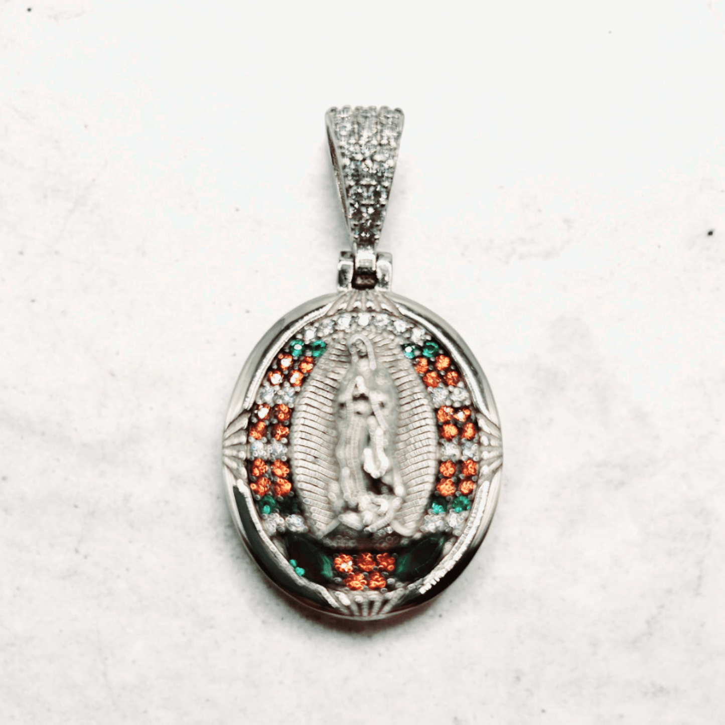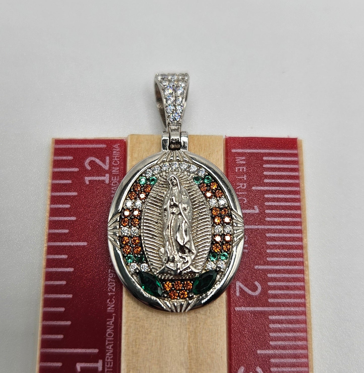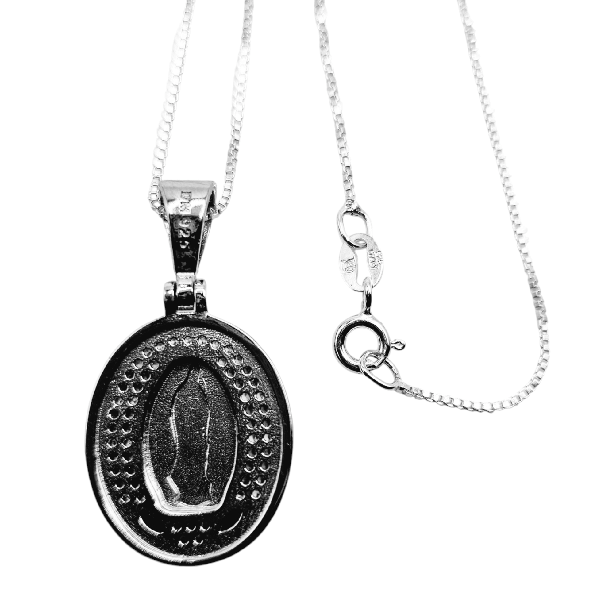 This Necklace is composed of a beautiful Virgen Mary pendant, crafted from Silver 925, features a detailed design and sparkling cubic zirconia stones in green, red and white colors. Choose to purchase the pendant only or as a necklace with the included 22" box chain Silver 925. A beautiful and meaningful accessory for any occasion.